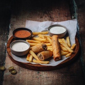 Two light crispy spring rolls - one with beef and one with chicken doner meat, served with fries and a set of signature sauces.